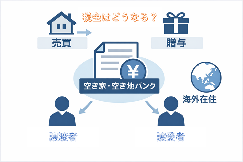 空き家・空き地バンクを利用した場合でも、税金の考え方は「誰が」「どのような形で」不動産を取得・譲渡するかによって整理する必要があります。以下では、譲渡者側と譲受者側に分けて、主な税金を整理します。