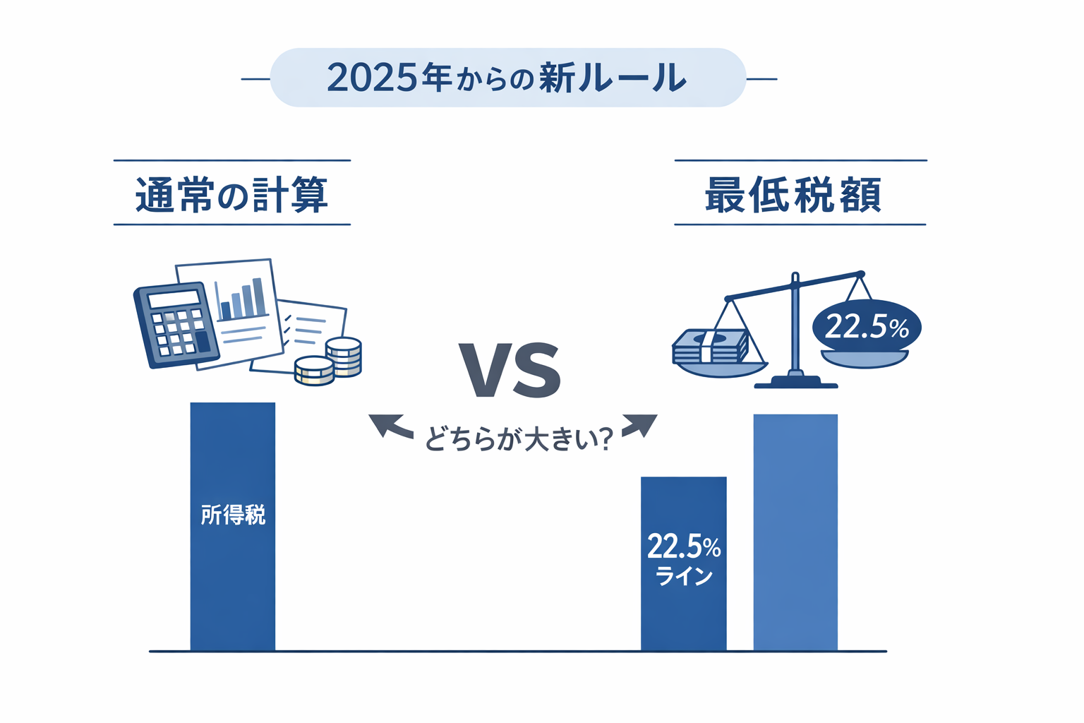 具体的には、基準所得金額が3億3,000万円を超えると、通常の所得税の計算方法とは別にもう一つの計算が行われます。基準所得金額から3億3,000万円を差し引いた金額に、22.5%を掛けるという計算です。この22.5%は、所得税と復興特別所得税を考慮した水準です。この金額が、いわば「最低限確保されるべき税負担のライン」になります。通常の方法で計算した所得税額と、この最低税額を比較し、多い方が最終的な税額になります。そのため、制度の対象になったからといって、必ず税額が増えるわけではありません。