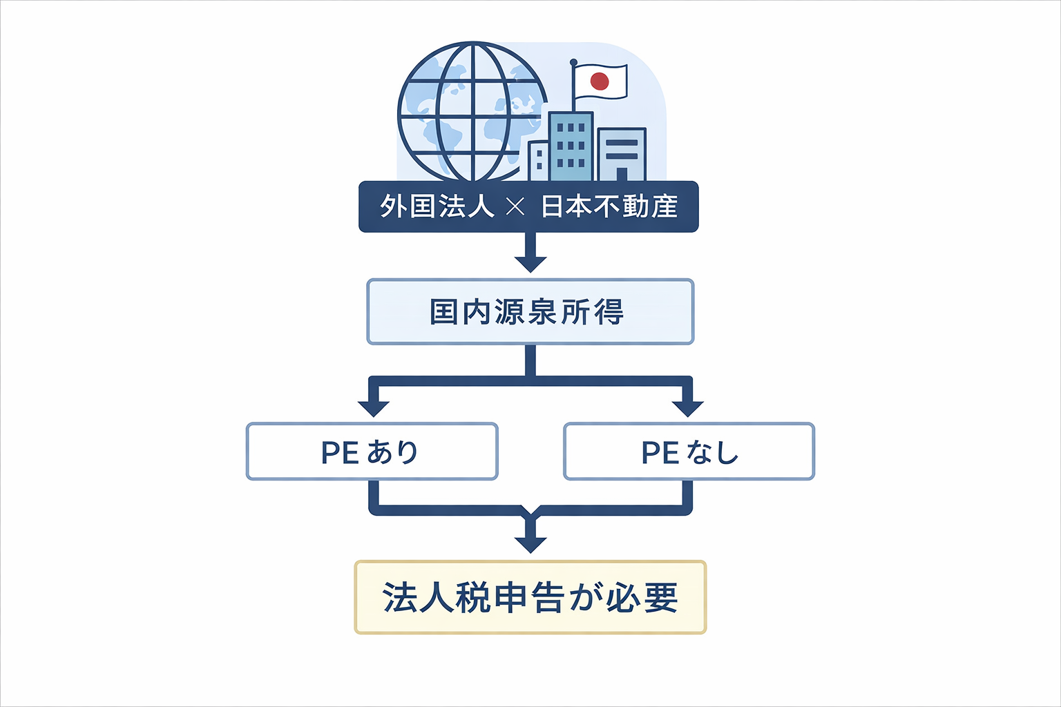 日本で不動産運用を行う外国法人にとって、最初につまずきやすいのが「日本で法人税の申告が必要なのかどうか」という点です。日本に従業員も事務所も置いていない場合、「日本では課税されないのではないか」と考えられがちですが、不動産貸付事業についてはそういうわけにはいきません。