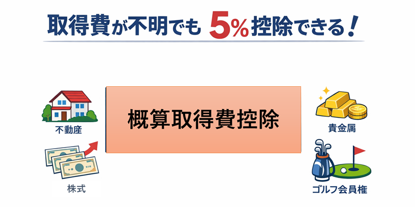 概算取得費控除とは、取得費が不明な場合に、譲渡収入金額の5%を取得費として控除できる制度です。