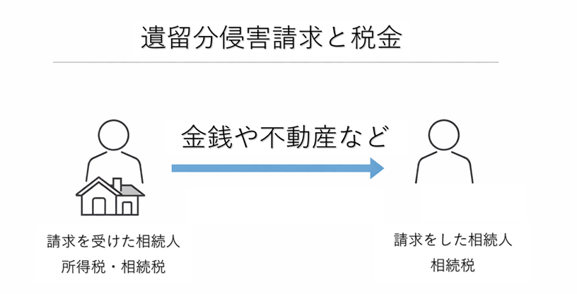 ここで重要なのは、現在の制度では「金銭請求になる」という点です。つまり、原則として現物(不動産など)ではなく、お金で調整する仕組みになっています。遺留分侵害請求権を行使するかどうかは各相続人の自由ですが、いったん行使すると行使した相続人、行使された相続人それぞれに税金の問題が発生します。個々での税金は主に相続税と所得税です。